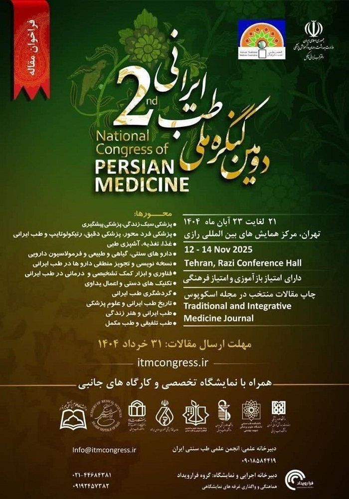 به اطلاع پزشکان و صاحب نظران حوزه سلامت و علاقمند به مکتب طب ایرانی می رساند، دومین کنگره ملی طب ایرانی به همت انجمن علمی طب سنتی ایران و حمایت دفتر طب ایرانی وزارت بهداشت در تاریخ ۲۱ الی ۲۳ آبان ماه ۱۴۰۴ در مرکز همایش های رازی برگزار خواهد شد.