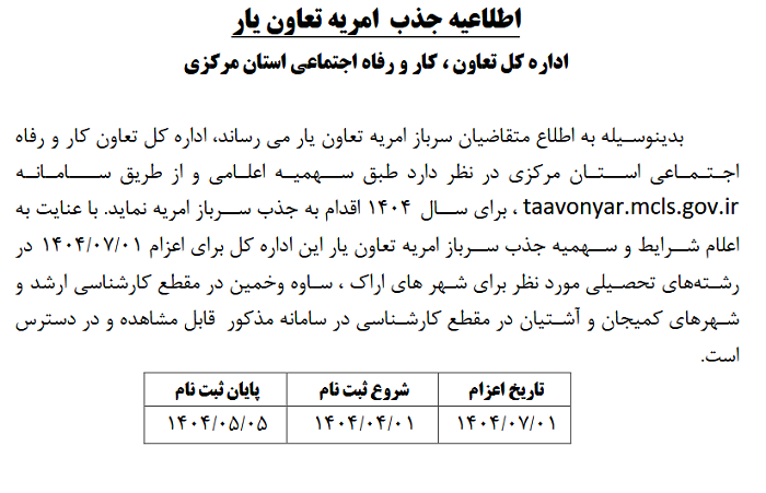 اطلاعیه جذب امریه تعاون یار ۱۱ تیر ۱۴۰۴ | ۱۲:۰۴ کد : ۵۲۷۴۸ اطلاعیه ارسال به دیگران نام شما ایمیل شما ایمیل دریافتکننده ارسال انصراف تعداد بازدید:۱۲۳۱ اطلاعیه جذب امریه تعاون یار