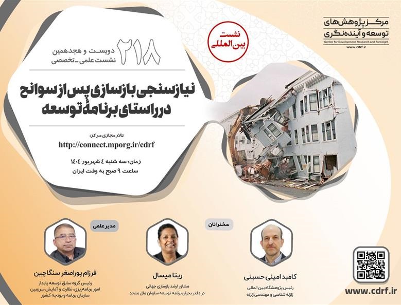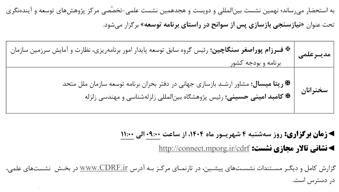 نشست علمی نیاز سنجی بازسازی سوانح در راستای برنامه توسعه ۰۳ شهریور ۱۴۰۴ | ۱۲:۳۷ کد : ۵۴۰۰۰ اطلاعیه ارسال به دیگران نام شما ایمیل شما ایمیل دریافتکننده ارسال انصراف تعداد بازدید:۱۶۰۸ نشست علمی نیاز سنجی بازسازی سوانح در راستای برنامه توسعه، توسط مرکز پژوهش های توسعه و آینده نگری برگزار می گردد.